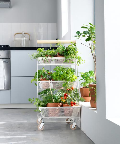 Another item that helps to maximize growing and garden space is to utilize a rolling utility cart to keep your herb and veggie pots on. You can place your sun-loving herbs or veggies on the top shelf and the ones that favor more shade can stay beneath on the lower levels. This is a really nice looking way to display and grow your pants too and the best part… when the cooler weather hits you can literally wheel the cart in and grow them indoors near a window and vice versa.