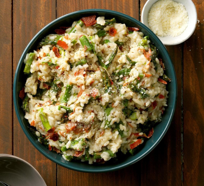The process of making Risotto is pretty simple once you get used to it. All Risottos come together with Arborio rice and whatever type of stock your recipe calls for. You put the risotto into a pan with a bit of melted butter and let the rice absorb it. Once it has you start adding a ladleful of stock to the pan stirring until the Risotto absorbs the broth. You then add another ladleful to the pan and do this again and again. This gradual process cooks the rice while coaxing out the starch to form a creamy sauce… without the use of cream! You then customize to whatever you recipe specifies. Let’s take a look at 10 scrumptious Risotto recipes that you and your family will enjoy for a yummy weeknight or anytime meal.