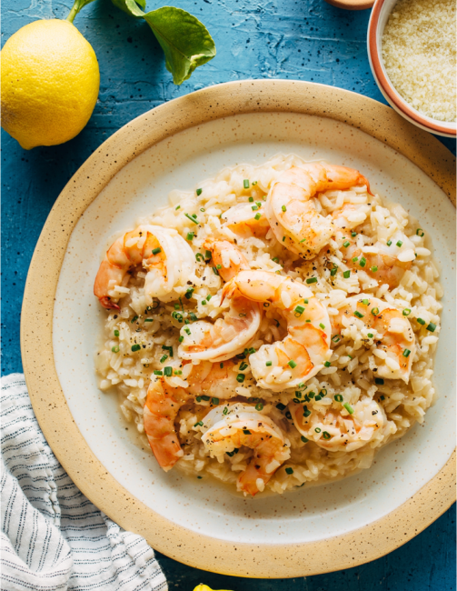 This will be a yummy recipe to make and this is one I will be making soon. As you know…. Risotto is made with various broths, cooked into Arborio rice to create a creamy delicious batch of risotto. For this one… you need Shrimp stock to make this delicious batch of Risotto using the shrimp shells from the shrimp you will be using in the recipe. Once the broth is made you will use it to mix into the Arborio rice, one ladle at a time and letting the broth absorb fully into the rice. This will create a delicious and creamy risotto that you will top with delicious shrimp. and for me… some Parmesan cheese.