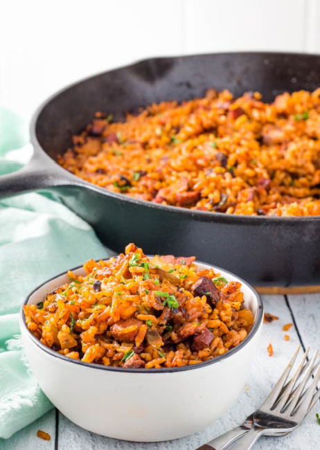 This is a recipe I have not made for myself but my mom made this all of the time when I was a kid. I just love this recipe and will be recreating it for my own family this week. It is comforting and hearty and the sausage of the perfect pairing with the yummy red rice. I grew up outside of Charleston, SC and this is an iconic Charleston dish that I truly love. You can eat this on its own or serve with pork chops or any other protein you choose. I say Pork Chops as that is what my mom would make with red rice and she would sometimes bake them and other times she would fry them and fried pork chops are so good! It is a mix of rice, bacon, yellow onion, bell pepper, smoked sausage and some spices…. and the end result is a delicious bowl of goodness.