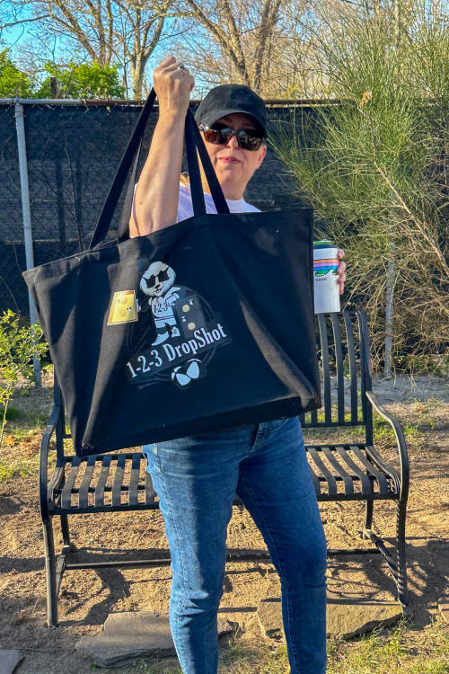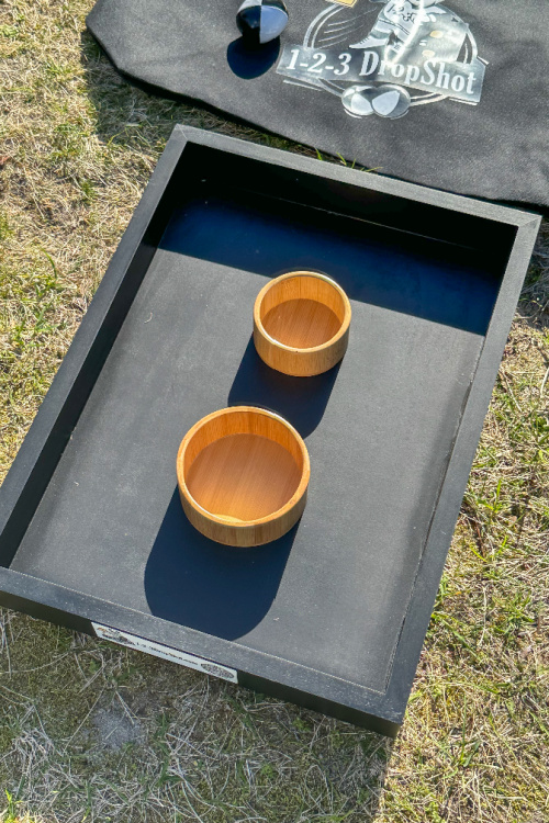The 1-2-3 DropShot game is available in two styles… I recieved the 1-2-3 DropShot in Black with Bamboo Cups and there is also another version that is made of all Bamboo which is beautiful. The game is not heavy at all, no more than 10 pounds when packed into the carry bag that it comes with making it super easy to take with you anywhere and everywhere. I just love this game and cannot wait to play it all summer long.