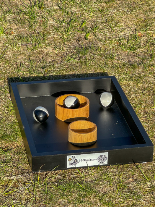 1. Place the 1-2-3 DropShot Boxes 7 to 10 feet apart with the large bamboo cup facing forward.