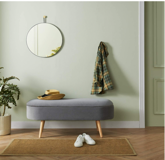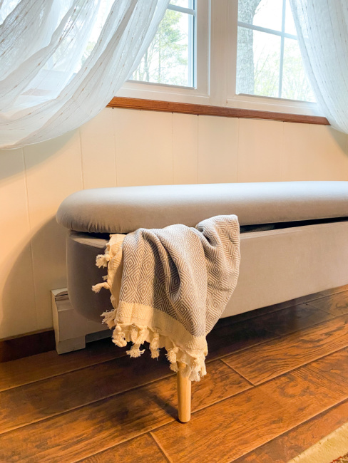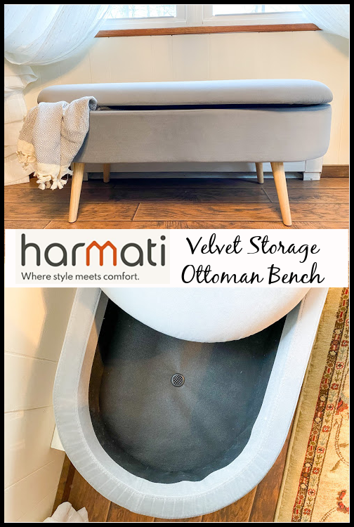 I love that the Harmati Velvet Ottoman Storage Bench is comfortable and versatile too. It’s soft upholstery feels amazing and the high-density foam cushion makes this upholstered bench the perfect additions to any room in need of both a comfortable seat and extra storage.