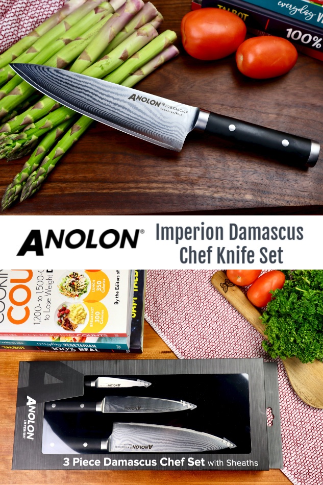 With Father’s Day right around the corner… I have been on the hunt for the perfect gifts that will let my husband know how much my kids and I appreciate him and love him. Finding the perfect gift can be really challenging as he has most of what he loves and needs but….with his new found one of cooking…. it got me to thinking that he could use an amazing set of knives. Every chef and home cook needs the proper tools to create those yummy meals and a fabulous set of knives is a must. This is the reason that I jumped at the chance to check out Anolon’s Imperion Damascus Chef Knife Set. This set is spectacular and is forged so that each knife is a masterpiece that delivers premium-quality knife performance that will last for years and years to come and each knife delivers premium-quality knife performance that every home chef needs.