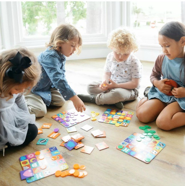 This fun game includes 4 game cards, 24 icon cards and 80 bingo markers that are fun and colorful. This set will provide hours of fun and developmental play and it is a great way to get the kids off of the tech and playing.