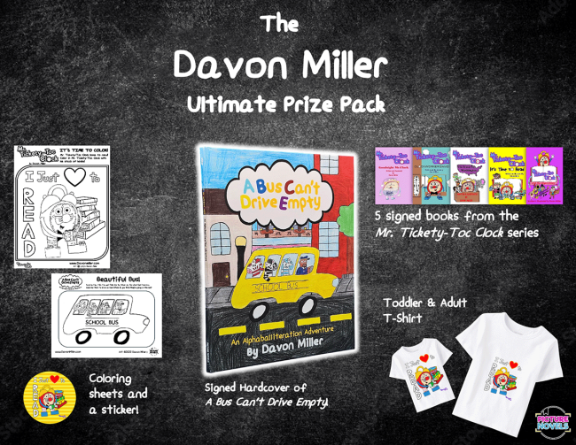 Enter for a chance to win a copy of A Bus Can’t Drive Empty: An Alphaballiteration Adventure by Davon Miller! And for one lucky grand prize winner, the ultimate prize pack includes a copy of A Bus Can’t Drive Empty, all five books from the Mr. Tickety-Toc Clock series, a Mr. Tickety-Toc Clock toddler tee and adult shirt, a themed coloring sheet, and a playful sticker from Davon’s first book series!