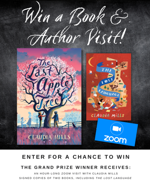 Enter for a chance to win one ten signed paperback copies of The Last Apple Tree by Claudia Mills. But wait, there’s more! One lucky grand prize winner will get a special one-hour Zoom author visit with Claudia herself, plus signed copies of The Lost Languageand a book from her wonderful chapter book series.