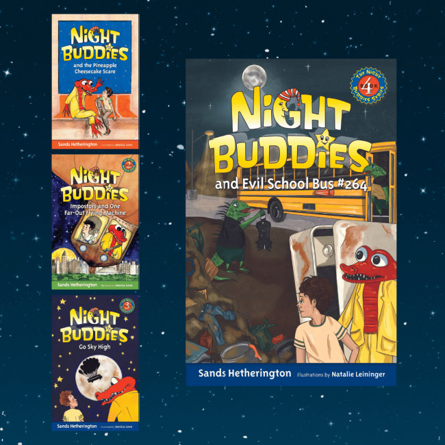 Enter the giveaway for for your chance to win an autographed 4-book series, including Night Buddies and the Pineapple Cheesecake Scare; Night Buddies and One Far-out Flying Machine; Night Buddies Go Sky High, and Night Buddies and Evil School Bus #264!