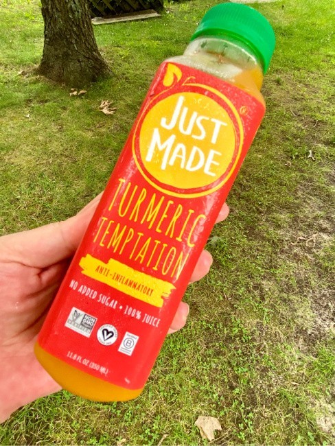 Just Made Turmeric Temptation: Blended with non-GMO passion fruit, pineapple, carrots and turmeric make it an excellent source of vitamin C, fiber and iron. These fruits are rich in antioxidants and turmeric can help relieve sore muscles and joint pain.