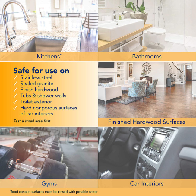 To use… simply use a fresh wipe on surface and simply wipe thoroughly. Once you do let it air dry. You can repeat for stubborn stains and for surfaces that come in contact with water… give a water rinse once you clean so that it is safe for food and food prep.