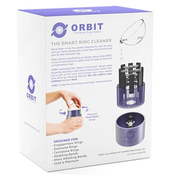 The ORBIT Smart Ring Cleaner does an amazing job at cleaning your rings with its patented 360 degree twist-brush technology that removes dirt, lotion, oils, make-up, food, grime and more.