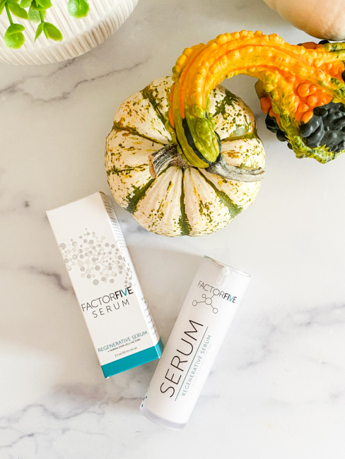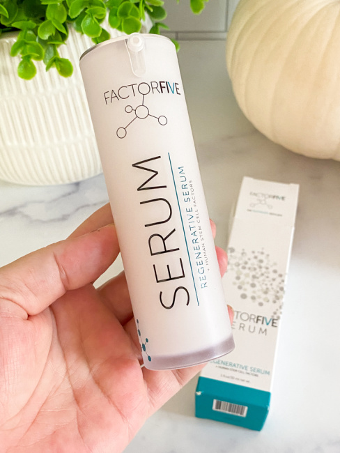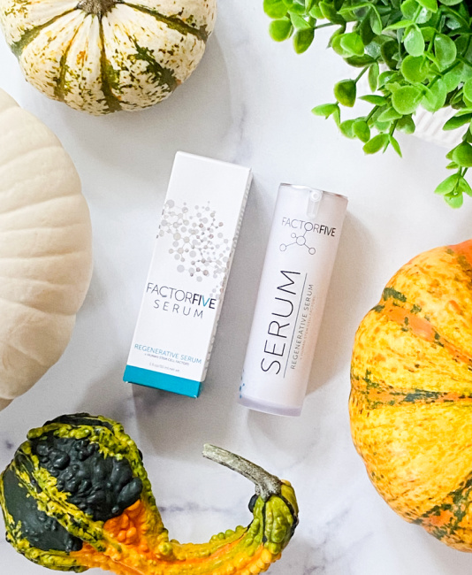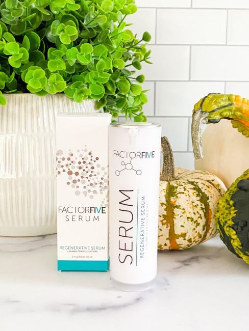 First let me tell you a bit about FACTOREFIVE Skincare which is backed by years of scientific research. Their award-winning skincare line has been created to redefine how we, as a society, look at aging. Their skincare products are powered by ethically derived human stem cells and FACTORFIVE works harmoniously with your own skin to replenish growth factors that naturally deplete as we age. The scientists behind the brand work with the most active producers of growth factors in the human body, adult stem cells (ACSs). They use a process to get those ACSs ‘speaking’ by sending out a tremendous amount of growth factor signaling and then they collect those powerful growth factor signals and include them as the main active ingredient in the FACTORFIVE Regenerative Serum as well as their other FACTORFIVE products, so that when you apply the serum to your skin, it replenishes your diminished supply and enables your cells to ‘listen’ and restart those important skin health processes that decrease as we age. This represents a 100% natural and biological way for your skin to return to vibrant health which is everything to me.