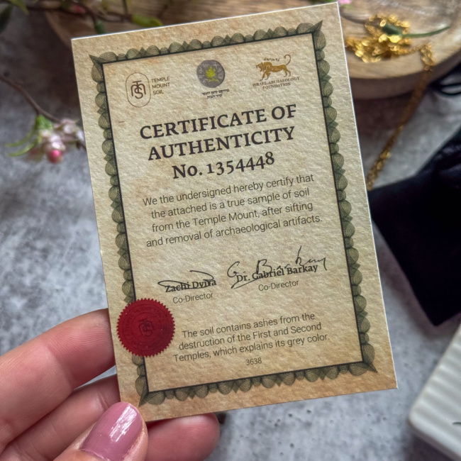 Rest assured that each purchase from Temple Mount Soil comes with an actual certificate of authenticity. Each bottle of Temple Mount Soil is certified by the Temple Mount Sifting Project, the sole authorized body for verifying its authenticity, and it is signed by the leading experts in biblical archeology, confirming both its origins and historical significance.