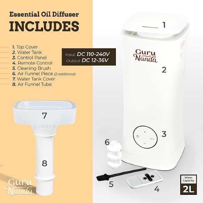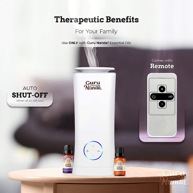 *NOISE-FREE DIFFUSER WITH HANDY REMOTE: GuruNanda’s stress-relieving ultrasonic humidifier comes with a remote for distant access, and provides nearly silent aromatherapy. It fills your space with the captivating aromas of pure essential oils. You can use it on your office desk, in the kitchen or in a large yoga studio.
