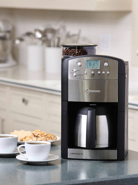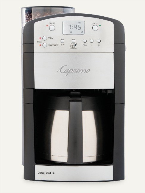 The CoffeeTEAM TS Coffee Maker from Capresso is packed with outstanding features that put it at the top of our list when we replace our old coffee maker: a 10-cup capacity stainless steel thermal carafe; an easy to clean permanent GoldTone Filter; a charcoal water filter to remove chlorine and other impurities; and an adjustable, built-in grinder to process your beans to your preferred taste profile !!!