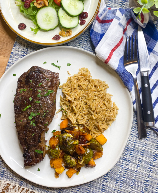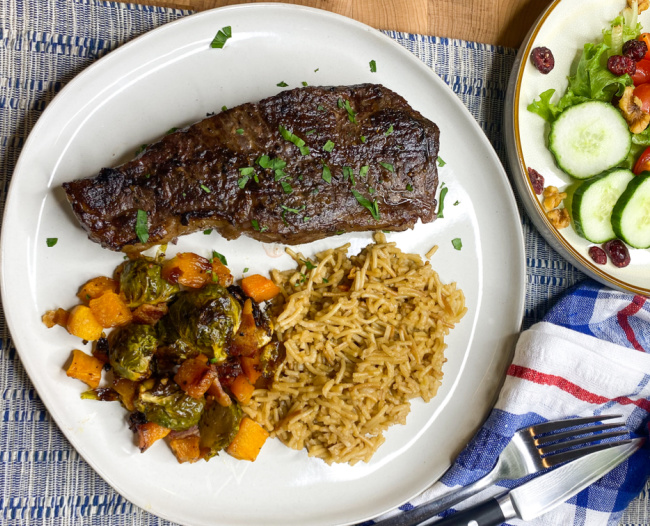 We love steaks over here. And that plate of steak with rice, brussels sprouts and butternut squash is my kind of dinner. Yum!