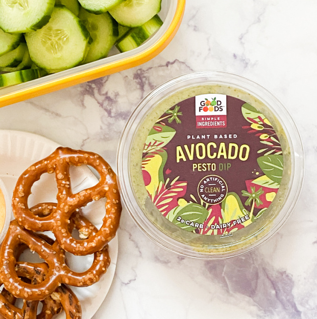Good Foods Avocado Pesto Dip is the perfect marriage of avocado and pesto. The 2 come together to create a delicious, creamy, dairy-free herb dip that has 75% fewer calories than the average pesto. The dip is Cauliflower based and includes the addition of delicious Hass Avocados that are hand scooped, fresh pesto, garlic and herbs. It is a delicious dip with no artificial ingredients and only 100% goodness.