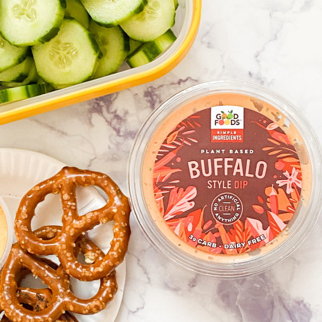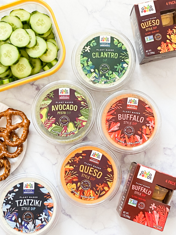 Now for convenience… I am loving the Good Foods Plant-Based Dip 4 Packs which are perfect for on the go. I toss these into my husbands lunch bag and he enjoys it with his pretzels or celery and carrot sticks. I received the Queso plant-based 4 pack and the Buffalo plant-based 4 pack.