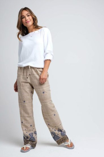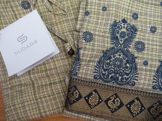 I received a pair of the Sudara Punjammies in the Jatha design and they are hands down the most comfiest pair of PJ pants I own. The Jatha print is made of Sudara’s super-soft 100% brushed cotton and the print features varying deep blue floral designs that dance across a crosshatched background of neutral sandy tones and light browns. These stunning Punjammies are finished off with a delicate gold and navy peacock border. There are side pockets which are fabulous and they have an elasticized waistband with a fabric drawstring trimmed with wooden beads. It is all about the details and Sudara does not miss a beat!