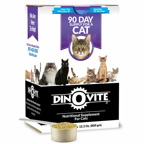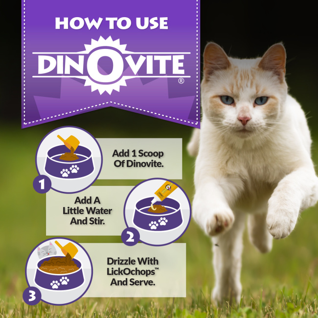 Dinovite® works great with any high quality meaty cat food-wet, dry or homemade. Their combination of amino acids, fatty acids, zinc, vitamins, direct fed microbials, enzymes and delicate nutrients can help support your cat’s immune system and body function and there are endless reviews that speak highly of the results that Dinovite can provide to your furry family member and especially for your feline.