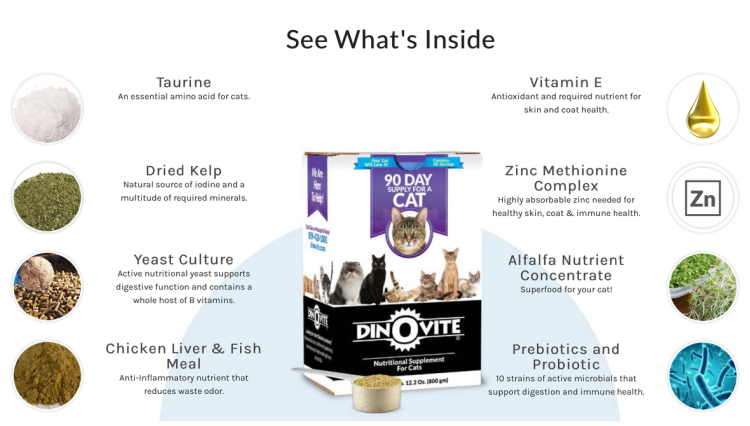 Now what makes Dinovite so amazing is everything that is packed in that Dinovite box. Dinovite for cats is a mix of Taurine, Vitamin E, Dried Kelp, Zinc Methionine Complex, Yeast Culture, Alfalfa Nutrient Concentrate, Chicken Liver & Fish Meal, Prebiotics & Probiotics and more. The benefits of each fo these ingredients are listed below…