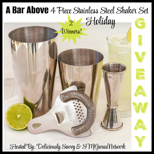 2 Lucky Winners Will Win this Giveaway! Both winners will win a 4 Piece Stainless Steel Shaker Set Valued At $46 ~ Perfect For Creating Cocktails Like A Pro! TRV $92!
