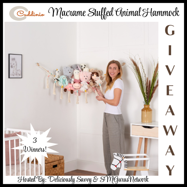 3 Lucky Winners Will Win this Giveaway! The 1st Place winner Will Win 2 Cuddinio Macrame Stuffed Animal Hammocks and the 2nd & 3rd Place Winners Will Each Win One Cuddinio Stuffed Animal Macrame Hammock! TRV $114!