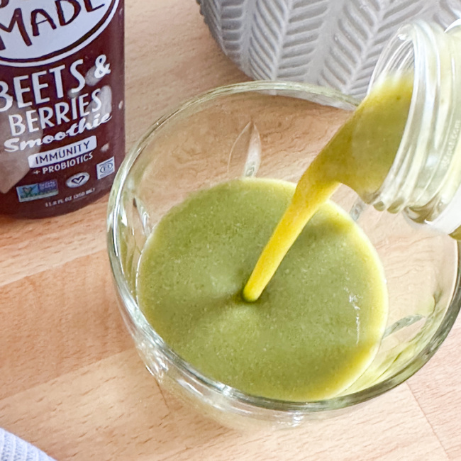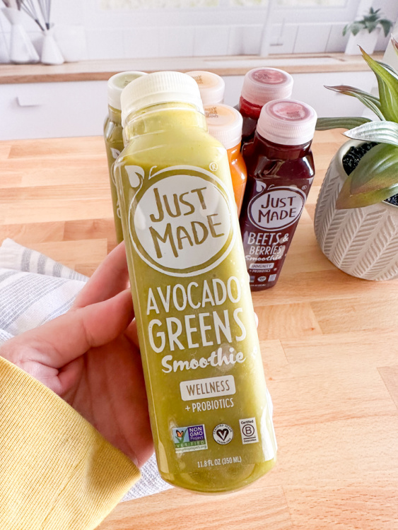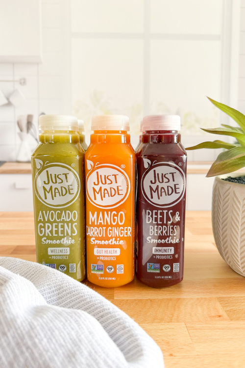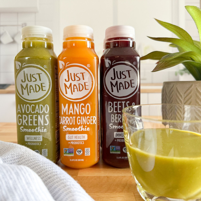 Before discussing the flavors of Just Made Smoothies let me tell you a but about what sets Just Made Smoothies apart from other smoothies. When most people think of a healthy smoothie, they think of a grainy juice drink that has a fake sugar aftertaste that no one wants. That is not the case with Just Made Smoothies. Their team got to work when creating their fabulous line of premium smoothies and the end result was that they crafted a nourishing, smooth, and nutrient-dense smoothie to market that you will love. With only 15 to 24 g of sugar and 150 to 160 calories per smoothie you can enjoy them everyday too! The best part…. these smoothies are 100% plant-based which means they’re packed with REAL ingredients all while providing a REAL traditional smoothie texture with NO added sugars and ALL of the benefits you are looking for. These smoothies are perfect for any diet you throw their way too……think meat-eaters, pescatarian, vegetarian, vegan, and gluten-free PLUS each smoothie is loaded with over 1+ billion probiotics and crafted to boost immunity, improve gut health and also brain health! Let’s take a look at the three flavor combinations…..
