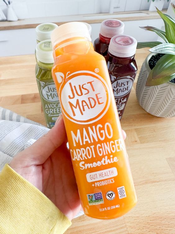 This Mango Carrot Ginger Probiotic Smoothie from Just Made is delicious and loaded with goodness! It is so yummy and the flavor combinations are everything. It is a delicious blend of mango, carrot, and ginger and it is not just delicious but beneficial for your body as a whole. What you get in this smoothie is 3/4 of a Mango and 1/3 of a carrot plus agave inulin, organic ginger juice, lime juice, filtered water and bacillus coagulant. Every smoothie that Just Made creates is packed with 1+ Billion Probiotics too for added gut health benefits as it is proven that the gut health of your body is tied to your bodies overall health and wellness which makes me love Just Made smoothies even more! They literally give your gut a hug and help to keep it flowing beautifully with all of the added probiotics contained within and that’s something that I love about these yummy smoothies from Just Made.