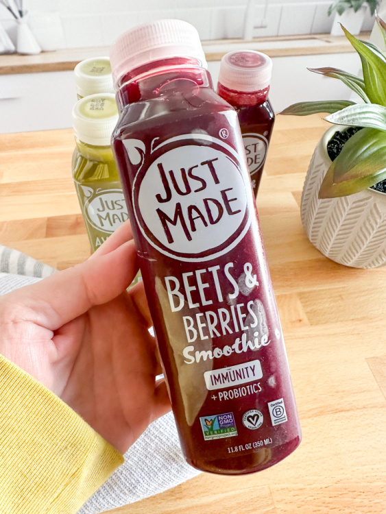 The Just Made Beets & Berries Probiotic Smoothie is hands down my favorite of the three and I cannot get enough of it. This bottle contains clean ingredients like 1/2 cup of blueberries, 3/4 of a beet plus blackberry puree, Pera juice, lime juice, agave inulin, chug mushroom, filtered water, and bacillus coagulant. This smoothie is so tasty and loaded with everything that I love PLUS the added 1+ Billion in probiotics is amazing for my bodies gut health which means it is good for my body and overall health and wellness.