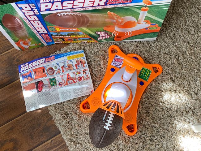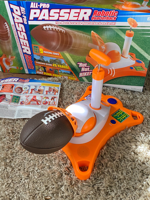 The All-Pro Passer Robotic Quarterback has nine different passing zones that allows you to practice hundreds of plays. Simply select your play, then press hike, slant, post, short or long. The All-Pro Passer throws the perfect spiral each and every time which is a total blast! Heck… I even had fun with this when paying with Scarlet! You can play one-on-one, three-on-three or with as many players as you would like and you can even practice catching on your own! This is perfect for taking with to the park or beach when out and about and it is most definitely perfection for your backyard. You get everything you need to start playing minus the batteries…. 4 “C” batteries.