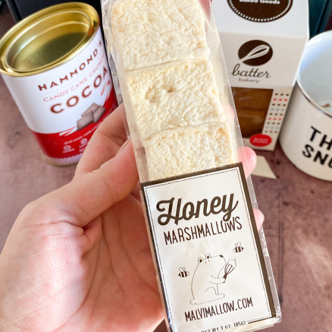 These amazingly yummy and delicious Golden Honey Whipped Marshmallows by Malvi are so good and I simply want to eat them all without adding to the S’mores as they are sooooo good BUT whoever you gift this box set too…they will love them and will for sure make the most delicious of S’mores when they make them. This box provides the most decadent of S’mores as well as hot cups of cocoa.