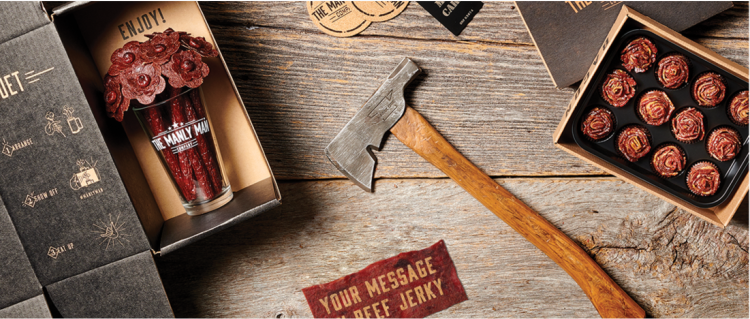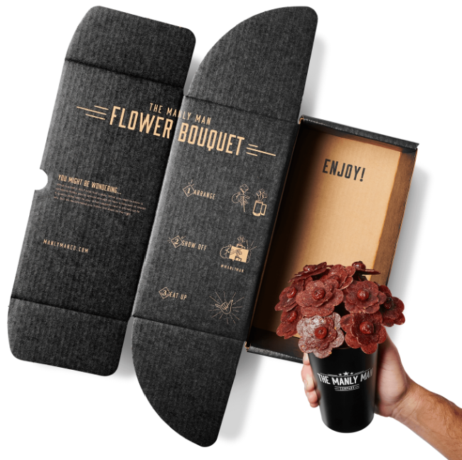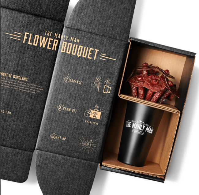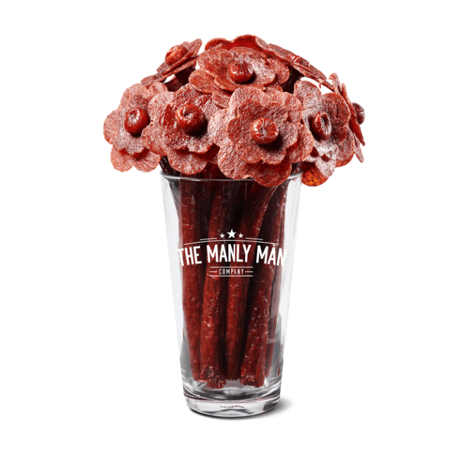 Each Beef Jerky Flower Bouquet is created in a vase that is a Manly Man pint glass that is perfect for your recipients favorite brew or drink. The bouquet is pre-arranged, sealed and packaged fresh with oxygen absorbers in a stylish branded box. The Manly Man Co. and their custom package design allows the bouquet to be delivered fully assembled and it easily slides out to provide the ultimate gifting experience.
