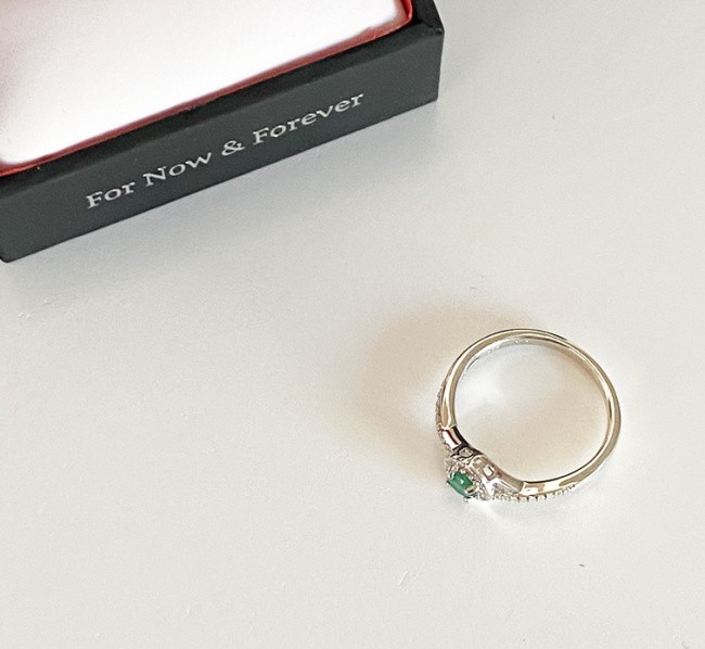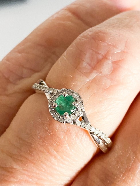 Is that ring not the most gorgeous thing you have seen? It is a petite ring… perfect for my daughter and the design is perfection as it is a beautiful infinity sterling silver ring that features one 4mm Emerald at its center, surrounded by 32 sparkling diamonds that total .10 carats. I have to say it gives off a beautiful sparkle when wearing and the diamonds are the perfect added touch to this Emerald masterpiece.