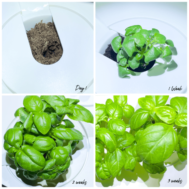 Now let’s take a look at my Basil Plants growing in the new Click and Grow Smart Garden 3. The picture below shows the day I started the garden and then 3 weeks worth of growth. This is really lots of fun and educational too for the kiddos as they can watch and grow their own herbs and veggies. My god daughter Scarlet absolutely loves it.