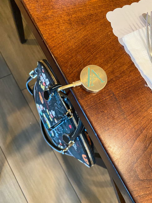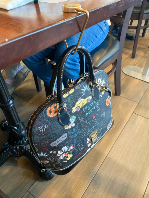 This is such an ingenious design and idea and I used the hooks immediately when my sister came into to town for a visit. We went to our favorite breakfast spot and she was able to hang her new Disney Dooney & Burke handbag safely and the best part is that you do not have to put it down onto the floor or worry about hanging it on your chair.