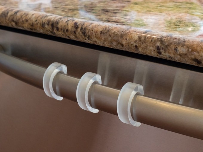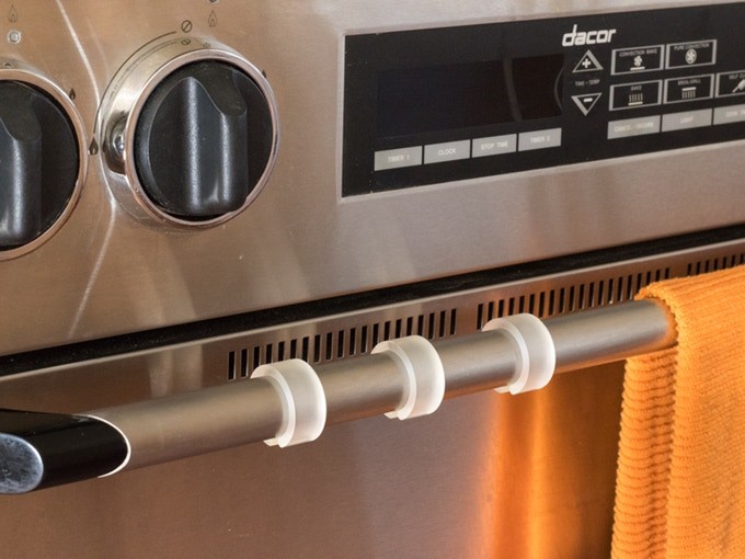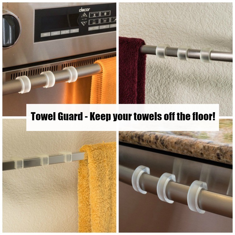 They have come up with an clever solution that fixes this problem perfectly and that does not affect the look of your kitchen or bathroom all while not forcing you to purchase special towels or to hang towels in alternate locations. That is why they created their Towel Guards to be small and translucent and also movable and removable without the use of adhesives so there is never any mess. You simply slide these onto your towels bars in your bathroom or onto the handle on your oven door or your dishwasher and then hang your kitchen towel or hand towel on top and poof….. your towel stays in place while you are drying your hands and more!