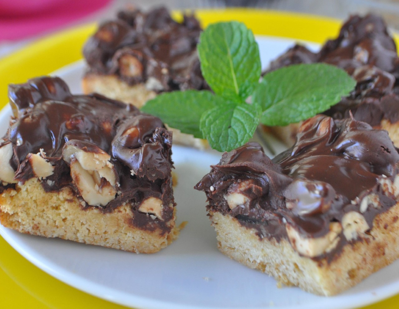 3) In medium pot or in microwave, combine raisins, peanuts, peanut butter, and chocolate chips over low heat stirring until melted.  Spread over baked crust.  Refrigerate 1 hour before cutting.