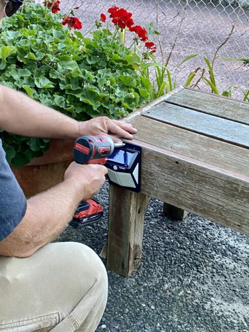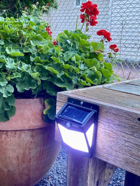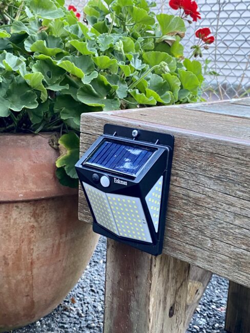 I received 2 sets of lights from Enkman. I received a 2 pack of Enkman 208 LED Outdoor Solar Lights and a 4 pack of Enkman 140 LED Outdoor Solar Lights. The Enkman 208 LED Solar Lights are the larger lights of the 2 options and they illuminate the area perfectly and are perfect for installing near your garage to illuminate the area when someone walks up and the 4 pack of Enkman 140 LED Solar Lights are perfect for installing on benches or on your deck stairs… whatever you may want to illuminate and they too are nice an bright.