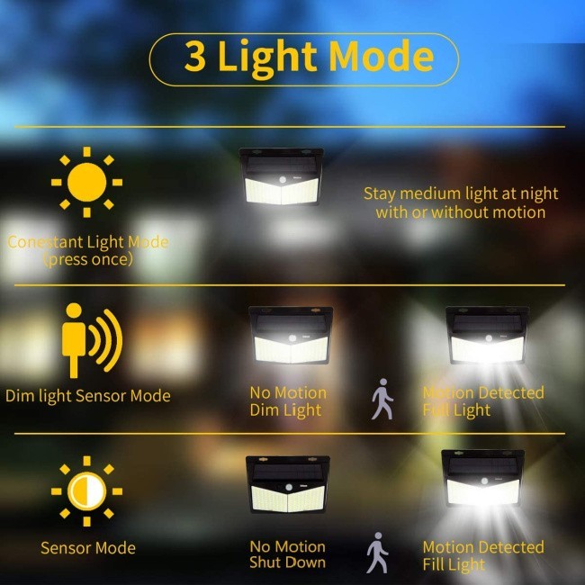 *3 Motion Sensor Modes: These upgraded super bright 140 LED Solar Light have 3 Modes for your diverse needs: ① Dim light mode, ② Dim light sensor mode, ③ Strong light sensor mode. The updated PIR motion sensor works so well as it detects people to up to 12-20 ft / 5-8m within angle of 180 degrees.