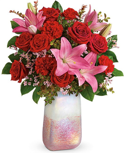 Your Valentine will go crazy over this masterpiece of red roses, pink Asiatic lilies, red carnations, pink Limonium and green accents. Inspired by the rose quartz gemstone that symbolizes love, this precious arrangement is nestled in a hand-blown art glass vase with soft pink gradient tones that will be cherished for years to come. This is a stunner and Strats at $109.99 for the standard size with the option to upgrade to the deluxe and premium sizes.