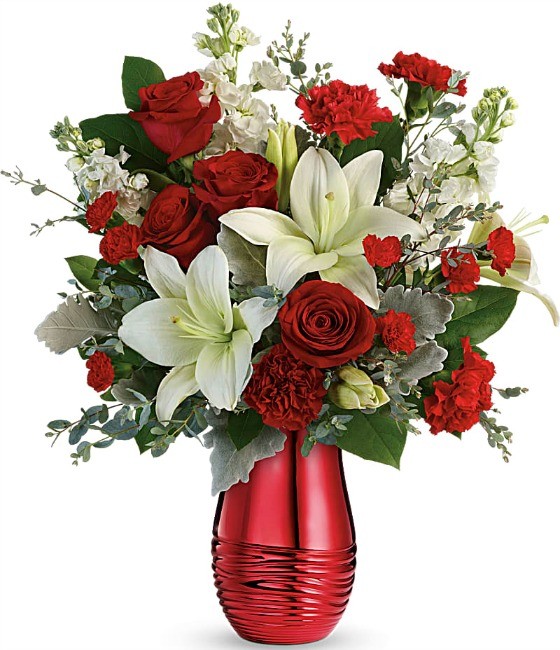Take your Valentine’s breath away with this beautiful and bold bouquet of lush red roses, white Asiatic lilies, red carnations and green accents. This striking arrangement is presented in a bright red mirrored ceramic vase that will make this Valentine’s Day red hot and that your recipient can use again and again. This beautiful arrangement starts at $79.99 and is also available in deluxe and premium options.