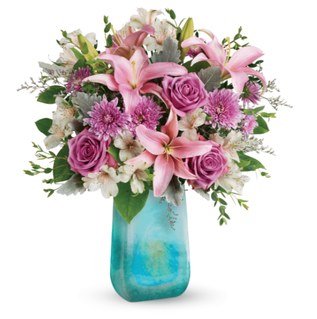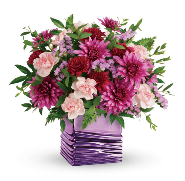This masterpiece is Teleflora’s Liquid Lavender Bouquet. With this gorgeous bouquet you will put mom in the spotlight with vibrant flowers that are expertly gathered inside of a bold, shimmering vase that is a sleek design in an alluring Lavender shade that will most definitely make this a gift to remember. Choose from standard, deluxe and premium sizes.