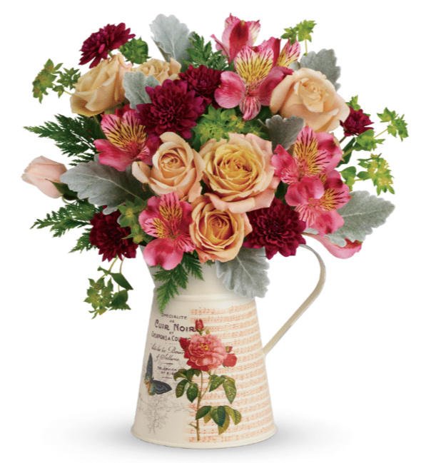 This is Teleflora’s Mod Mademoiselle Bouquet. You will surprise mom with this gorgeous bouquet overflowing with lush roses, red chrysanthemums and pink Alstroemeria. This beauty is delivered in a vintage inspired, hand-glazed watering pitcher that doubles as a quaint garden accessory. This floral selection is perfect for the mom with a green thumb or an eye for interior decorating and as with all Teleflora bouquets … this is available in 3 perfect size options.