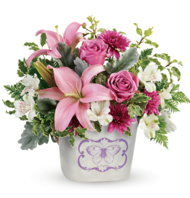 This is Teleflora’s Monarch Garden Bouquet. With this gorgeous arrangement you can celebrate mom’s unconditional love as it is bursting with soft pink roses, lilies and chrysanthemums nestled in a handglazed ceramic planter that is everything. Whether mom enjoys spending quiet time in the garden or relaxing at the spa, this