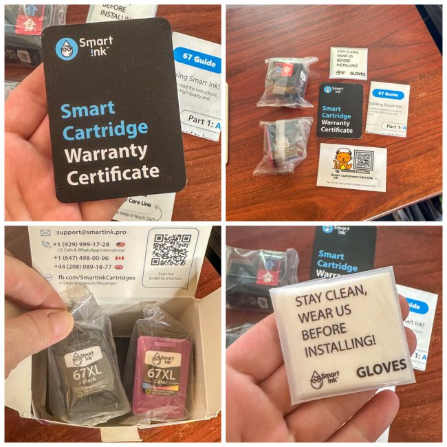I have to point out that I appreciate all of the extra steps that Smart Ink took when delivering my replacement ink cartridges. The box was filled with detailed step-by-step instructions, a set of gloves to use when replacing and installing the new Ink Catridges so that I would be able to replace them flawlessly without tampering or damaging the new cartridges plus a warranty certficate. Also…. if you need help with the installation process…. they have numbers and a QR scan code that will allow you to speak with a human right away too.