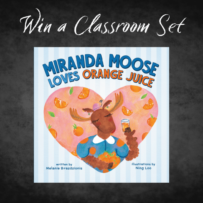 Enter the giveaway for your chance to win a signed hardcover copy OR a 25-book classroom set of Miranda Moose Loves Orange Juice!