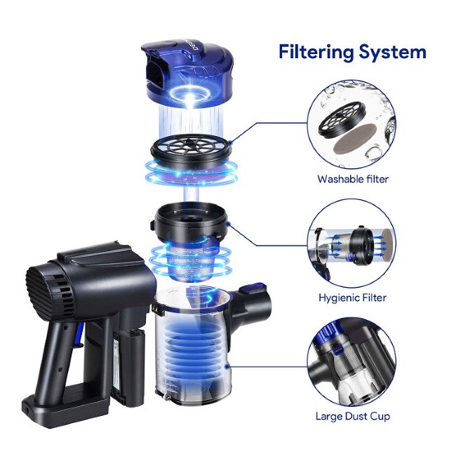 The DEENKEE Cordless Vacuum has a fabulous filtration system as well. The filtration system includes a HEPA filter, a metal filter and a pre-filter that capture dust, dirt, dog hair, food debris and more. The system locks in the small particles without leakage and expels non-allergenic fresh air in the process. All of the filters are nice too as they are washable and durable so that they are easy to clean and reusable.
