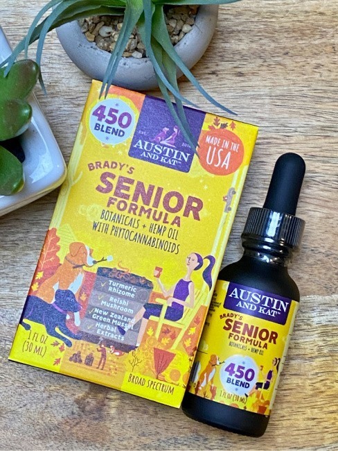 Austin and Kat’s Brady’s Senior Formula CBD Oil works hand in hand with CBD Rich Hemp Bites above. This product was developed through Kat’s years od experience with CBD and older dogs and it is created for pets ages 6 years and older. This is for sure the perfect was to promote your furry family members long term health and enhanced immune response.