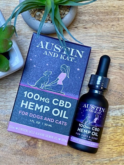 Austin & Kat creates CBD products that you can feel good about giving to your pets. They create Functional Oils, Classic Oils and Infused Bites that will help your dog (or cat) to be happier, calmer and healthier. Their products are especially helpful for aging pets who may be slowing down and having a harder time getting up in the morning due to stiff joints and more. This is the case with both of my pets who are slowing down as they age and which is why I am so excited to share these products with you as they work! Lets take a look at the products I received and why my pets are absolutely loving them….